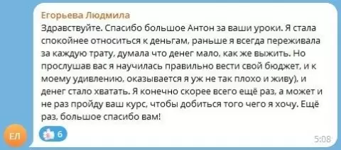Переживания о финансах могут превратиться в настоящее бремя, но осознанный подход и инновационные практики из курса Антона Сочешкова способны изменить восприятие материального мира. История Людмилы Егорьевой служит отличным примером такого преобразования.
