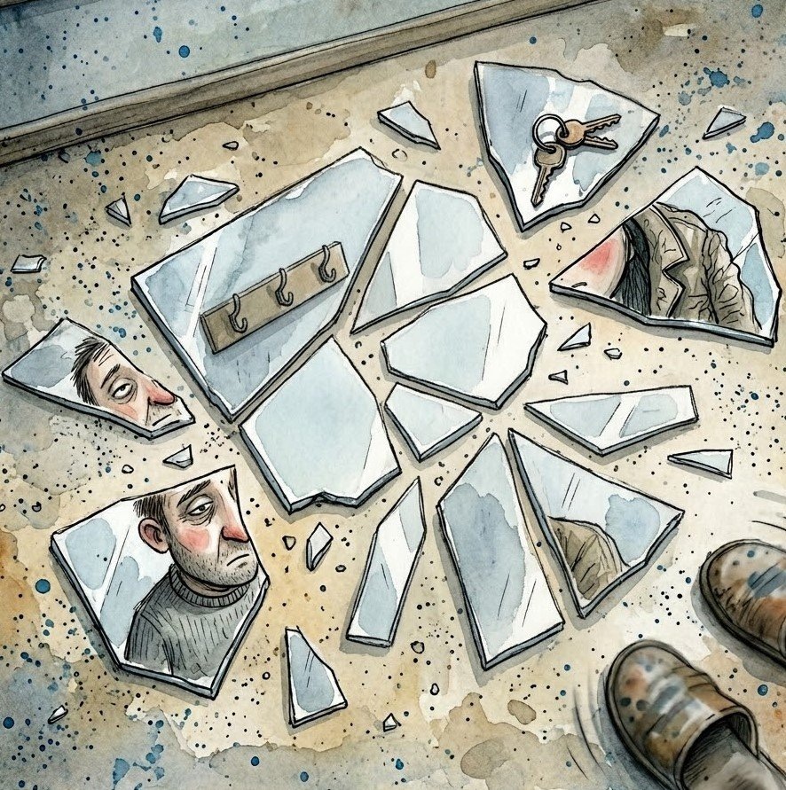 Он оказался на полу, разбитый на осколки, каждый из которых смотрел в свою сторону. Теперь никто не отражал его целиком, и лишь холодный линолеум свидетельствовал о его разрушении.
