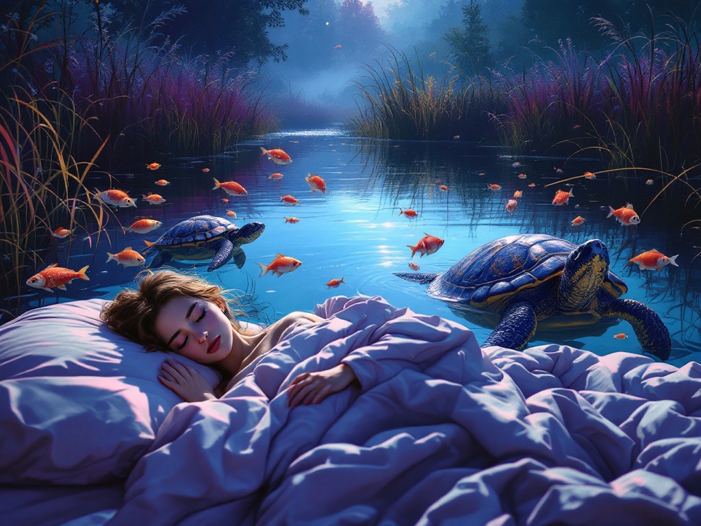 Черепахи, плывущие рядом с главной героиней сна, олицетворяют мудрость, спокойствие и уверенность. Эти животные учат движению к цели в медленном, но верном темпе, независимо от тех препятствий, которые могут возникать на пути. Их присутствие вместе с рывком рыб, символизирующих изобилие и веру, подчеркивает важность духовного роста и укрепления внутреннего мира.