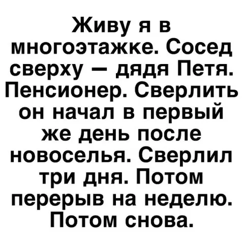 Сосед сверху, дядя Петя, пенсионер, проявил свои ремонтные таланты сразу в первый день после переезда. Сверлить он начал без усталости, а продолжался этот процесс целых три дня. Затем наступал перерыв, но ненадолго. Поднявшись к нему, поинтересовался: